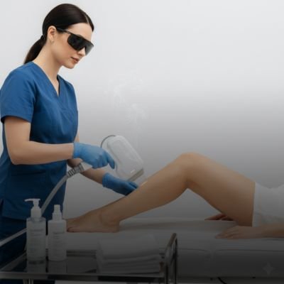 Woman receiving advanced laser hair removal treatment on legs by expert technician, bright white background, smooth results.
