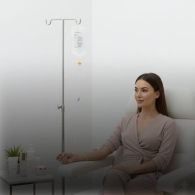 Aesthetic professional administering glutathione IV therapy for brighter, even-toned skin inside modern, well-lit skin clinic.