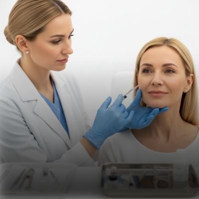 Cosmetic expert carefully injecting dermal fillers on face, enhancing features naturally with advanced skin rejuvenation technique.