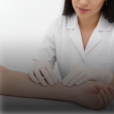 Dermatologist examining psoriasis-affected skin or treating old scars, providing soothing care in a clean medical setup.