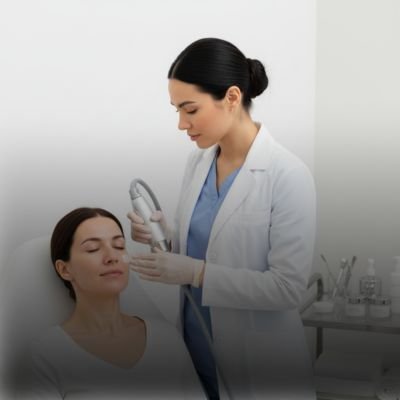 Dermatologist treating facial acne with precision in a modern clinic setting under bright, clean white background lighting.