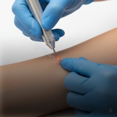 Laser specialist targeting unwanted tattoo pigment on forearm, erasing ink effectively in a clean, minimal background.